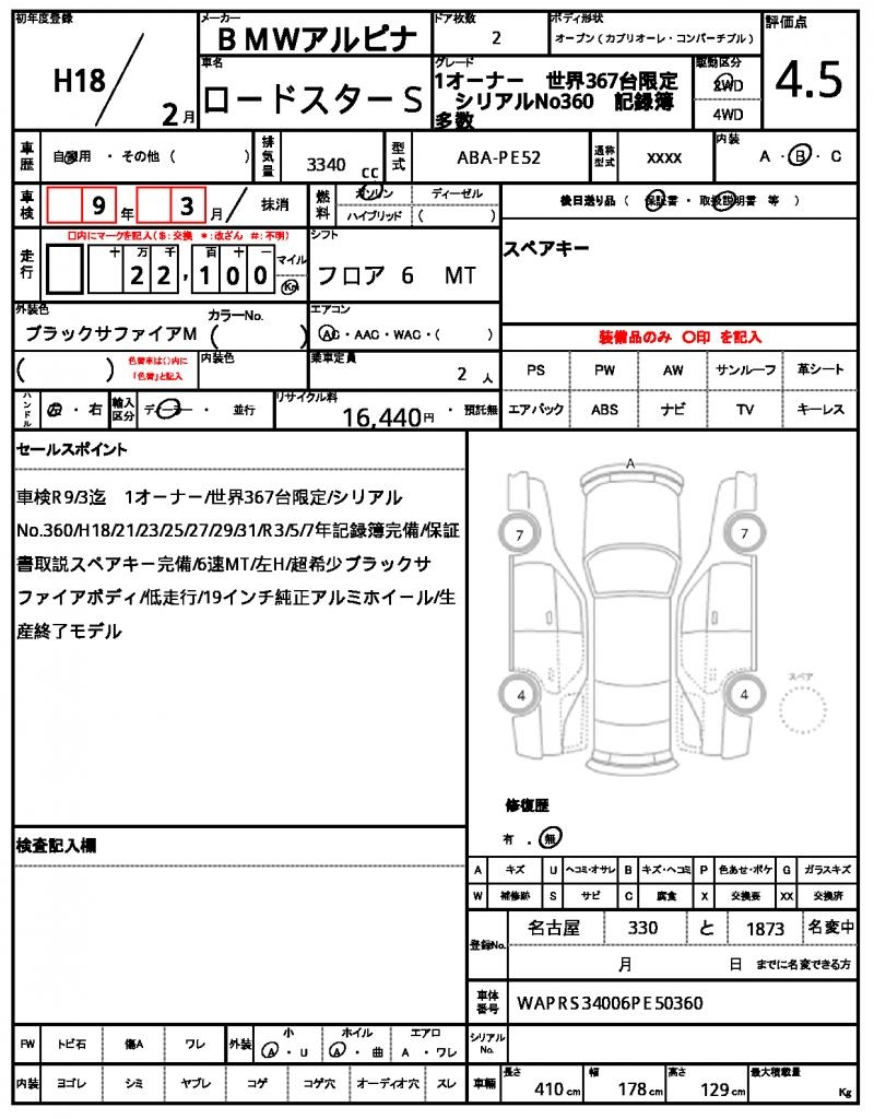 | BMW ALPINA | ROADSTER S | 2006 | 3340 cc | ||||||||||||||||