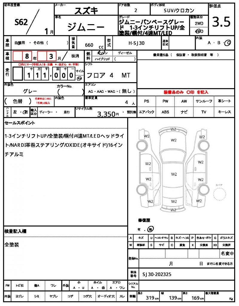 | Grade | Jimny Van Base Grade 1-3 inch Lift Up / Fully Painted / Top with Hood / 4-Speed MT / LED |