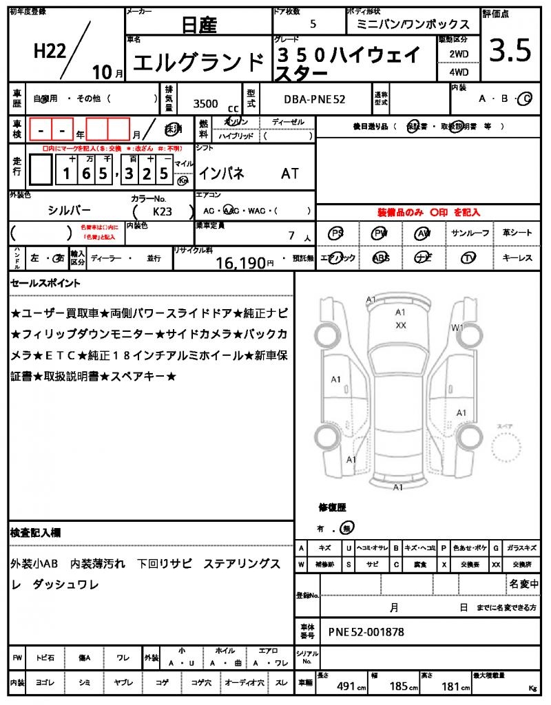 | NISSAN | ELGRAND | 2010 | 3500 cc | ||||||||||||||||
