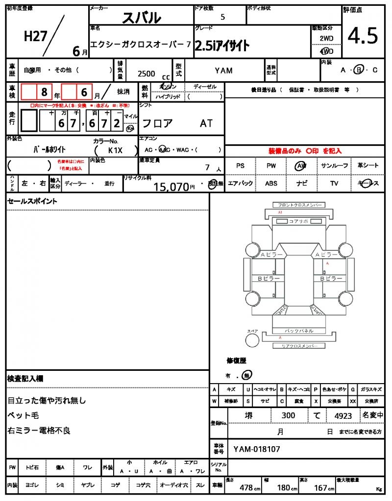 | SUBARU | EXIGA CROSSOVER7 | 2015 | 2500 cc | ||||||||||||||||