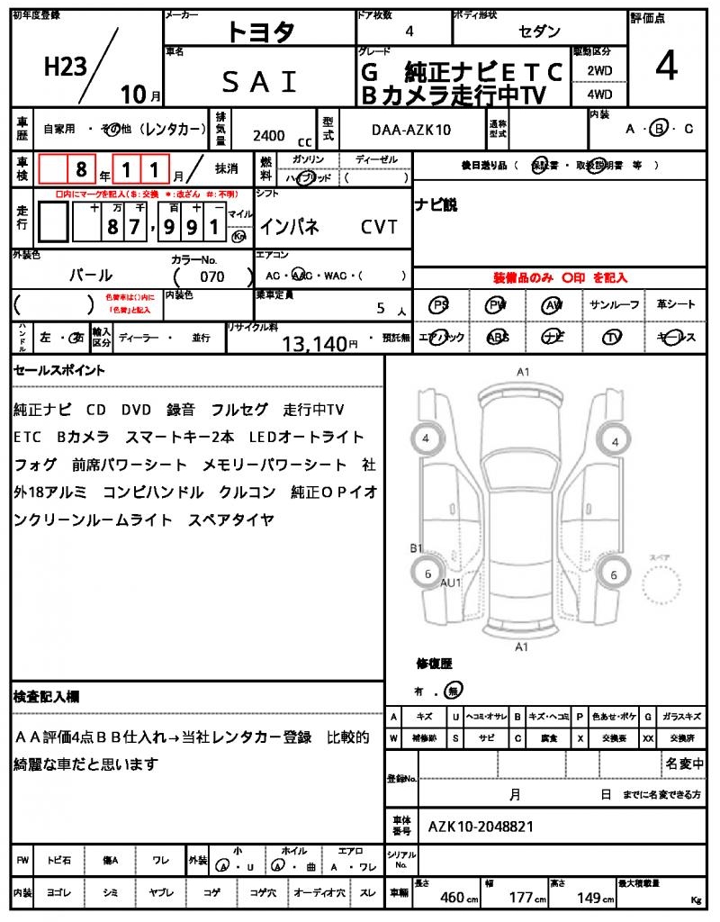 | TOYOTA | SAI | 2011 | 2400 cc | ||||||||||||||||