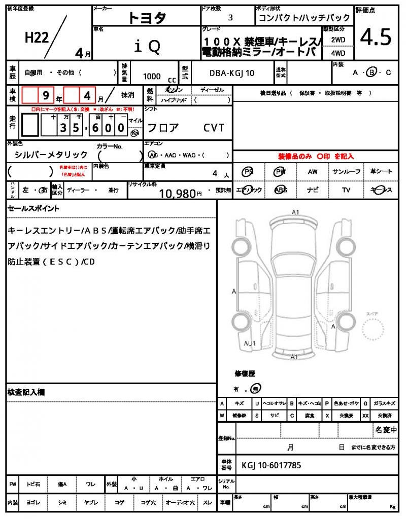 | TOYOTA | IQ | 2010 | 1000 cc | ||||||||||||||||
