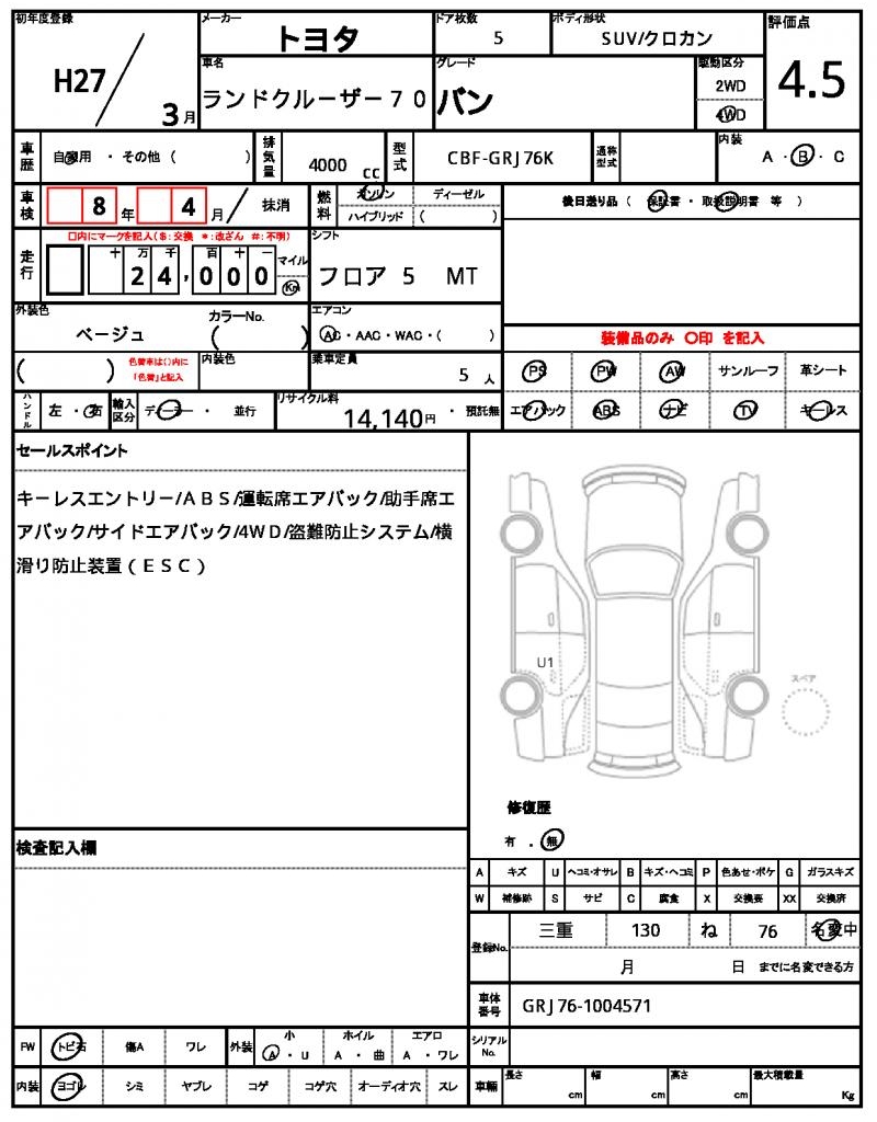| TOYOTA | LAND CRUISER 70 | 2015 | 4000 cc | ||||||||||||||||