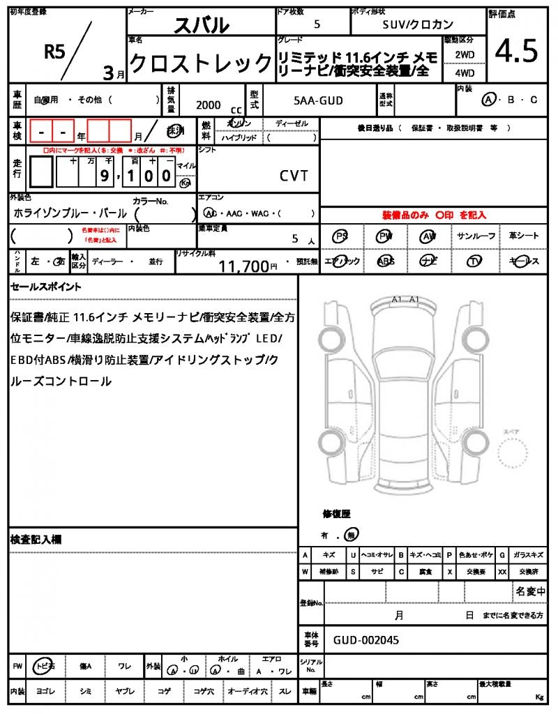 This 2023 Subaru Crosstrek is a sleek blue SUV that’s ready to hit the road. Powered by a 2000cc gasoline engine and featuring power steering and power windows, this Crosstrek is a convenient and reliable ride. As a used car from Japan, this Subaru Crosstrek is available for international buyers through AutoXGlobal, making it easy to bring this great ride home. With its aluminum wheels and 2WD drive, this Japanese used car export is a great value for those looking for a reliable and feature-packed SUV.