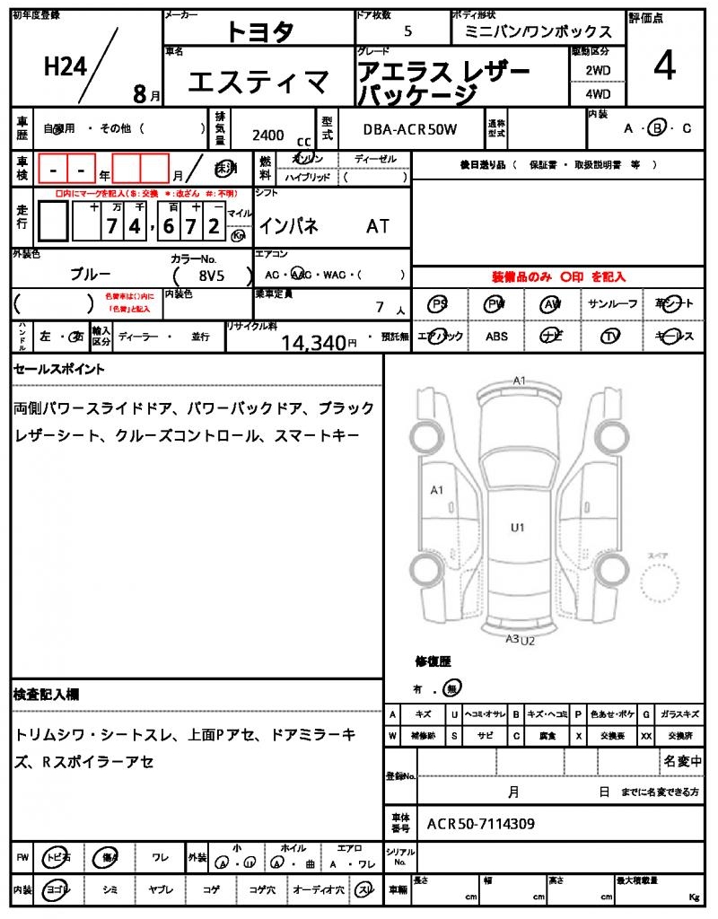 | TOYOTA | ESTIMA | 2012 | 2400 cc | ||||||||||||||||