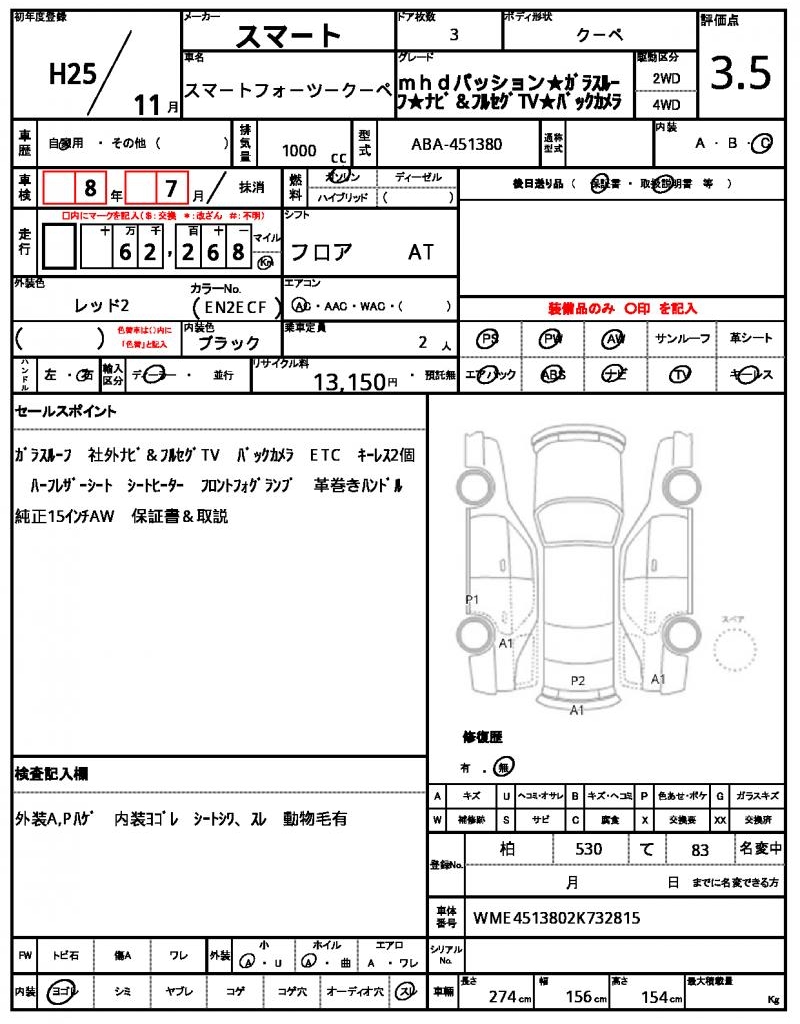 | MCC SMART | SMART FORTWO COUPE | 2013 | 1000 cc | ||||||||||||||||