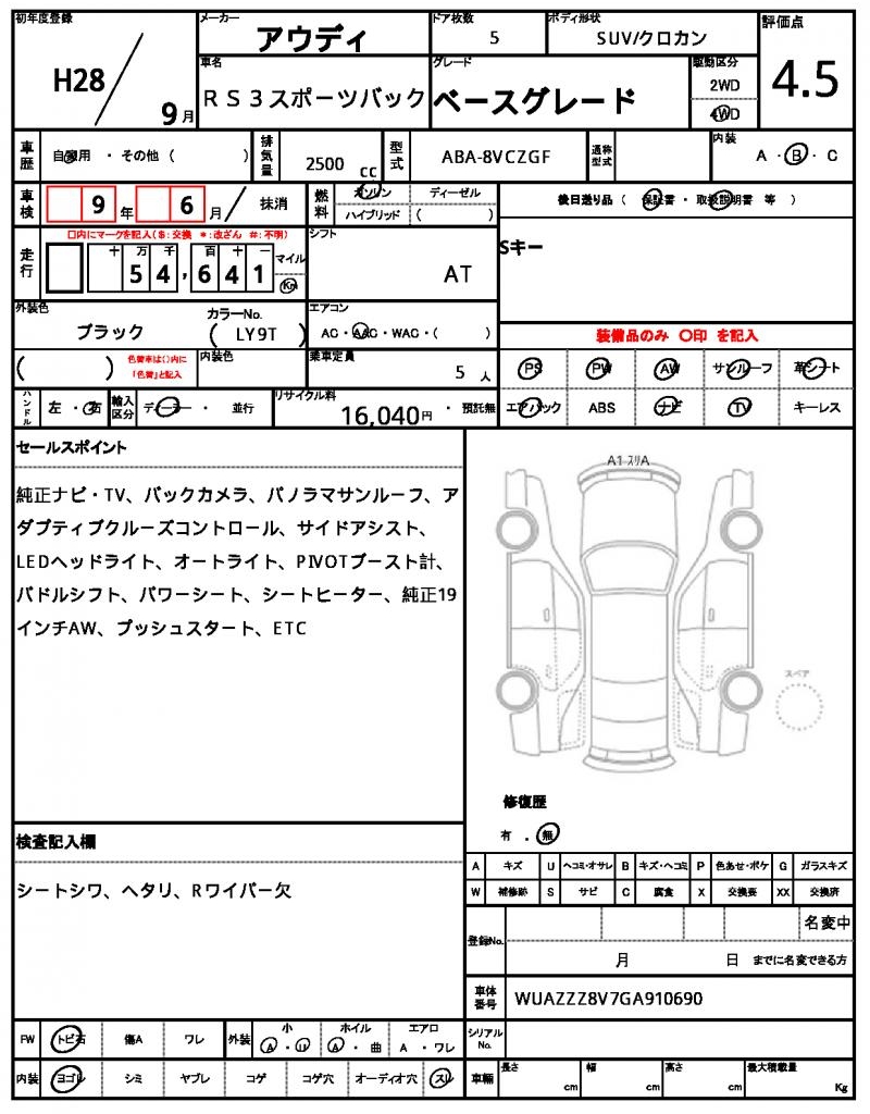 The 2016 Audi RS3 Sportback is a sleek black SUV that packs a punch. Under the hood, you’ll find a 2500cc engine fueled by gasoline, paired with a 4WD drive system and featuring power steering and power windows. This is a used car from Japan available for international buyers through AutoXGlobal. Get behind the wheel of this impressive Audi RS3 Sportback, a Japanese used car export that’s sure to turn heads.