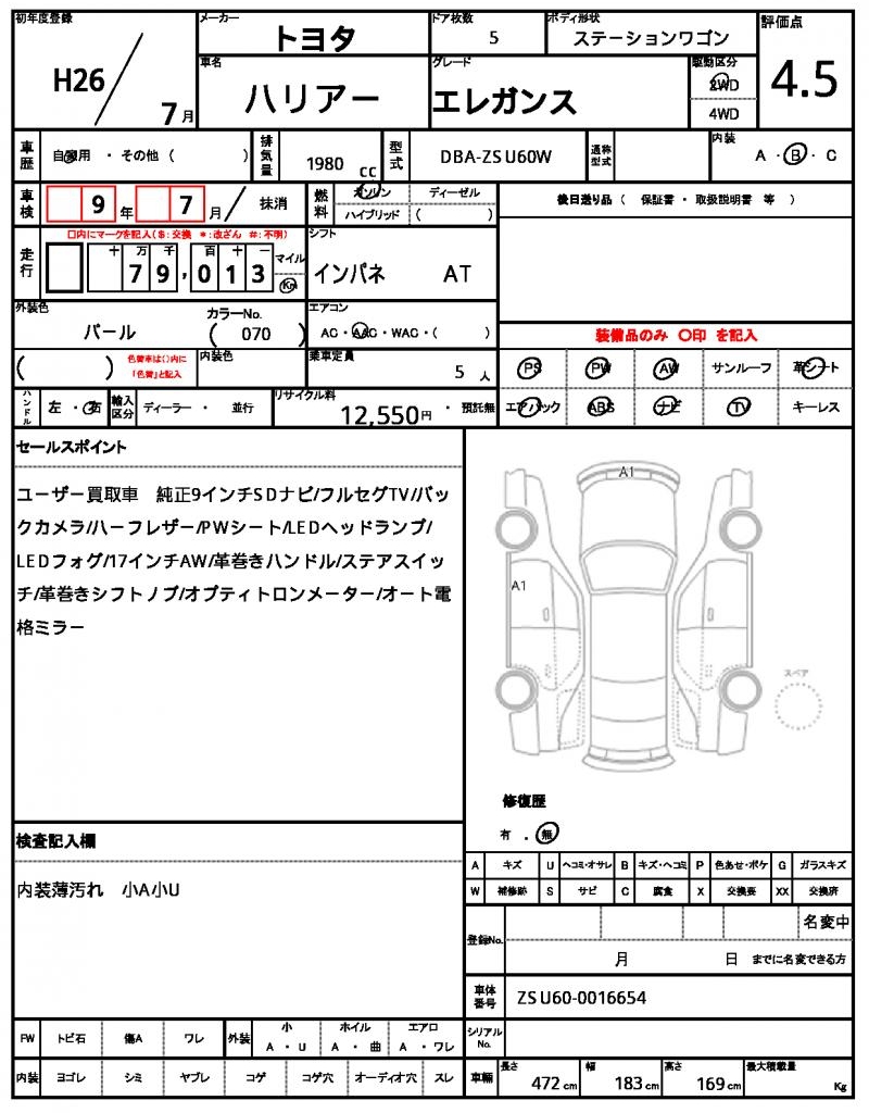 | TOYOTA | HARRIER | 2014 | 1980 cc | ||||||||||||||||