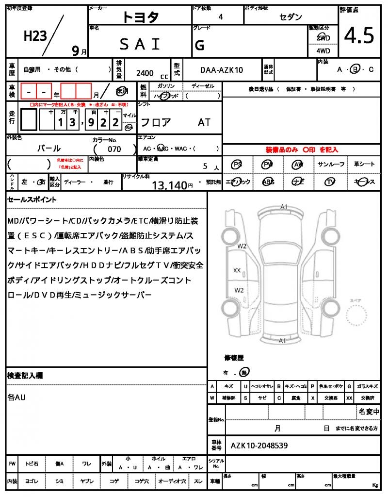 | TOYOTA | SAI | 2011 | 2400 cc | ||||||||||||||||
