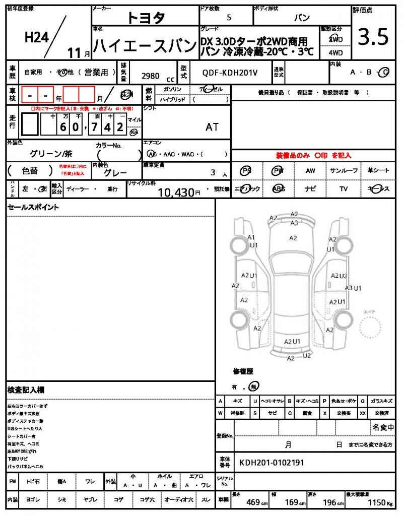 The 2012 TOYOTA HIACE VAN is a reliable green minivan that’s perfect for families or businesses. Under the hood, you’ll find a 2980cc diesel engine paired with 2WD, making it a great option for everyday driving. As you cruise around, you’ll appreciate the power steering and power windows that make getting in and out of tight spots a breeze. This well-maintained HIACE VAN is a used car export from Japan available through AutoXGlobal for international buyers.