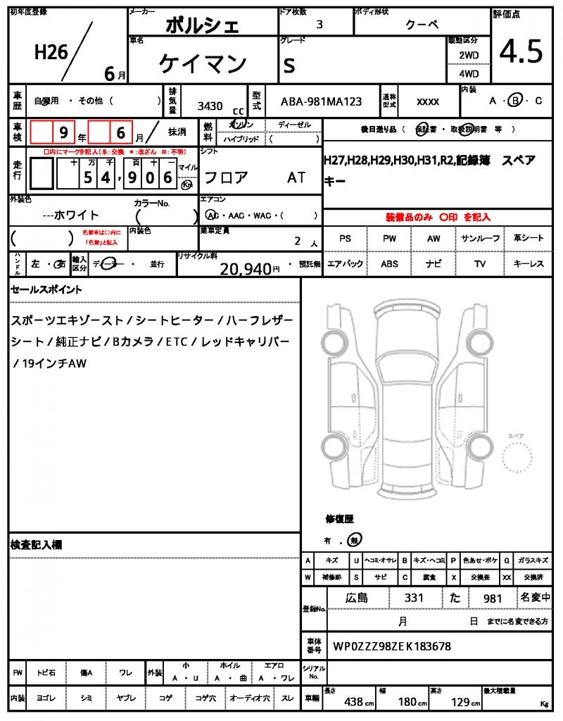Meet the 2014 Porsche Cayman, a sleek white coupe that exudes performance and style. Under the hood, you’ll find a powerful 3430cc gasoline engine, paired with a smooth 2WD drive system. As a used car export from Japan, this Cayman is available for international buyers through AutoXGlobal, complete with a maintenance log and record book to ensure its history is well-documented. With its impressive specs and no accidents to speak of, this Japanese used car export is a great opportunity to own a piece of Porsche luxury.