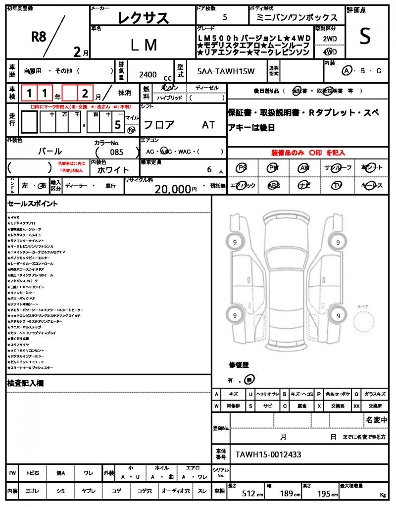 Meet the 2026 LEXUS LM Pearl Minivan, a reliable and family-friendly ride that’s perfect for road trips or daily commutes. Under the hood, you’ll find a 2400 cc gasoline engine paired with 4WD for all-weather traction, and enjoy features like power steering and power windows for added convenience. As a used car from Japan, this LM is available for international buyers through AutoXGlobal. Explore the Japanese used car export market with us and take the keys to this 2026 LEXUS LM Pearl Minivan home today.