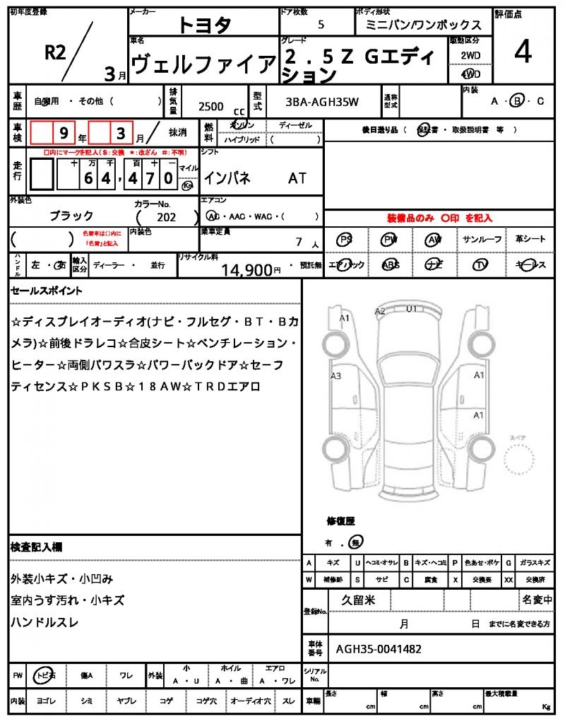 The 2020 Toyota Vellfire is a sleek black minivan that packs a punch under the hood, powered by a 2500cc gasoline engine and featuring 4WD for smooth handling. With power steering and power windows, this Toyota Vellfire is designed for ease of use. As a used car from Japan, this Vellfire is available for international buyers through AutoXGlobal. Check out this reliable and feature-packed Japanese used car export, the 2020 Toyota Vellfire, today!