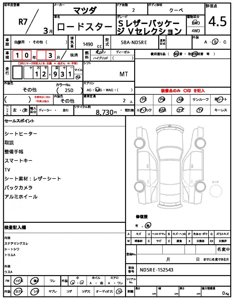 Meet the 2025 MAZDA ROADSTER, a sleek Pearl-colored Coupe that’s sure to turn heads. Under the hood, you’ll find a 1490 cc gasoline engine, paired with a 2WD drivetrain and equipped with power steering for effortless handling. As a used car from Japan, this MAZDA ROADSTER is available for international buyers through AutoXGlobal. This Japanese used car export is a unique opportunity to own a piece of the Mazdaspeed legacy, with features like power windows and Aluminum wheels rounding out the package.