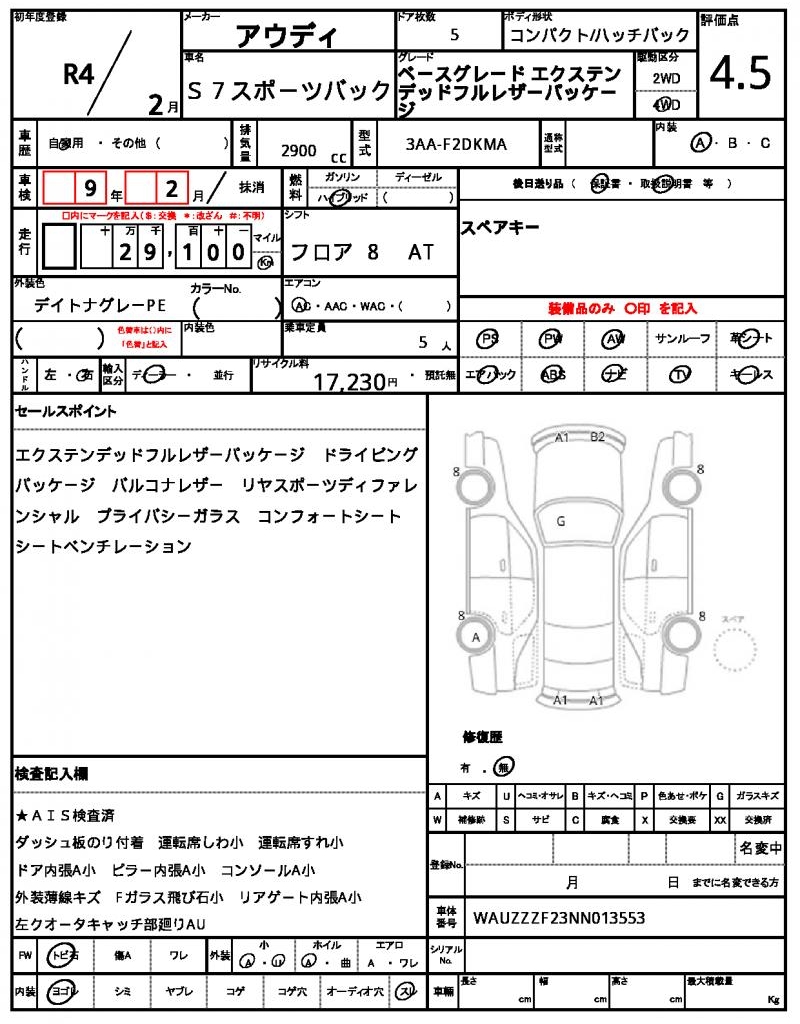 This sleek 2022 AUDI S7 Sportback in gray is a hatchback that combines style with performance. Powered by a 2900cc hybrid engine, it boasts 4WD capabilities and features like power steering and power windows, making for a comfortable and controlled driving experience. As a used car from Japan, this AUDI S7 Sportback is available exclusively through AutoXGlobal for international buyers. With its impressive specs and Japanese used car export quality, this AUDI S7 Sportback is a top choice for anyone looking for a reliable and feature-packed ride.