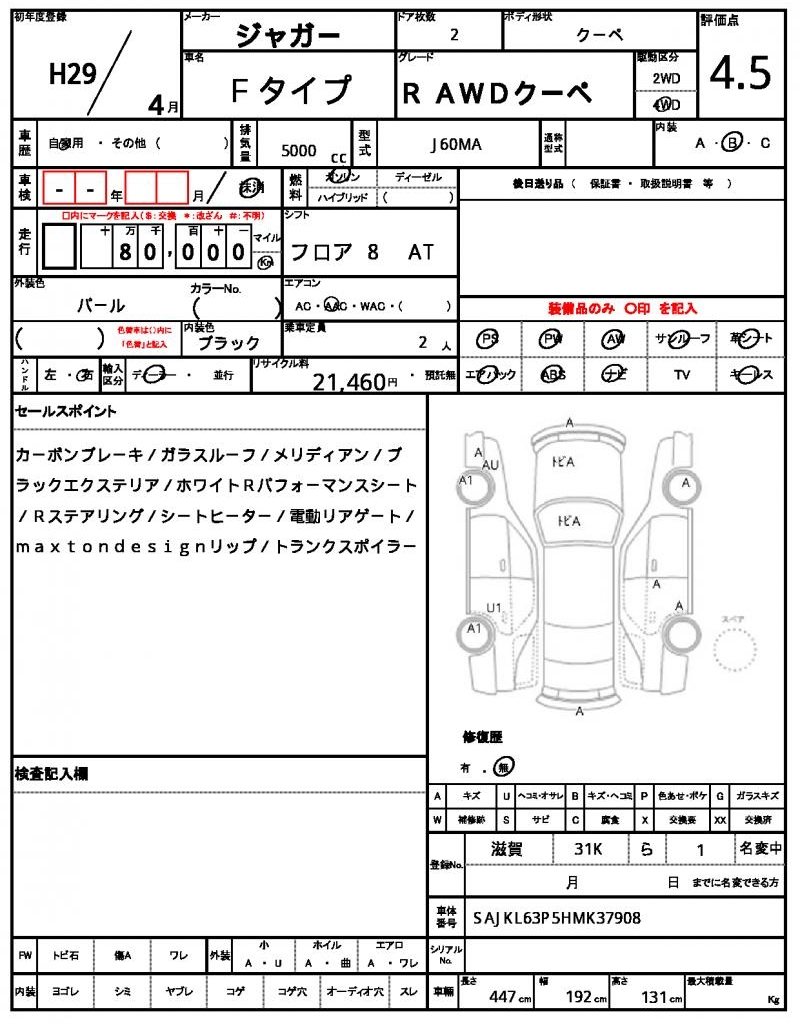 The sleek and powerful 2017 Jaguar F-Type Coupe in black is a head-turner on the road. Under the hood, you’ll find a 5000cc gasoline engine paired with 4WD, and enjoy features like power steering and power windows for a smooth and convenient driving experience. As a used car from Japan, this F-Type is available exclusively through AutoXGlobal for international buyers. For those looking for a high-performance coupe, the 2017 Jaguar F-Type export from Japan is a rare find.