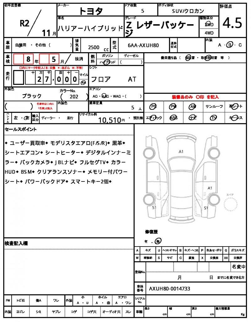 The 2020 Toyota Harrier Hybrid is a sleek black SUV that offers a perfect blend of style and practicality. Under the hood, you’ll find a 2500cc hybrid engine providing efficient fuel consumption and a smooth driving experience, paired with a 2WD system and power steering for easy maneuverability. As a used car export from Japan, this vehicle is available through AutoXGlobal for international buyers looking for a reliable and feature-packed ride. With power windows and aluminum wheels, the 2020 Toyota Harrier Hybrid is a great choice for anyone seeking a comfortable and feature-rich SUV.