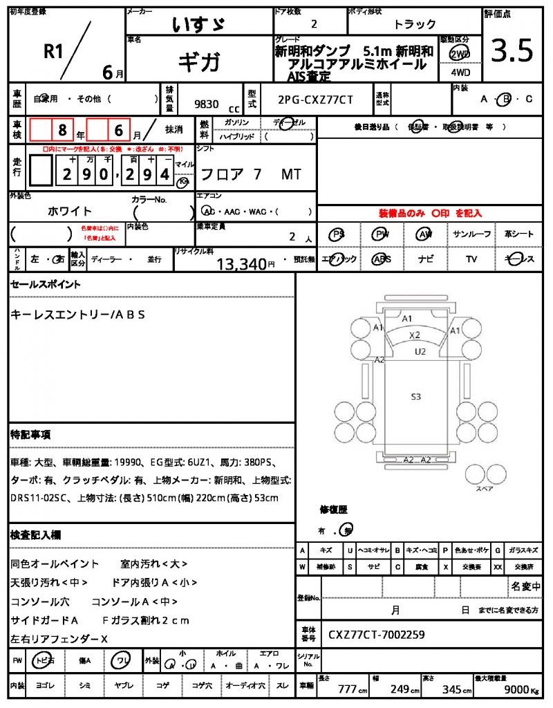This 2019 ISUZU GIGA white truck is a reliable workhorse with a powerful 9830cc diesel engine and 2WD drive system, making it perfect for hauling heavy loads. Enjoy features like power steering and power windows, making your driving experience more convenient. This vehicle is a used car from Japan, available for international buyers through AutoXGlobal. Don’t miss out on this great opportunity to import a Japanese used car – this 2019 ISUZU GIGA is a great choice for anyone looking for a durable and dependable truck.
