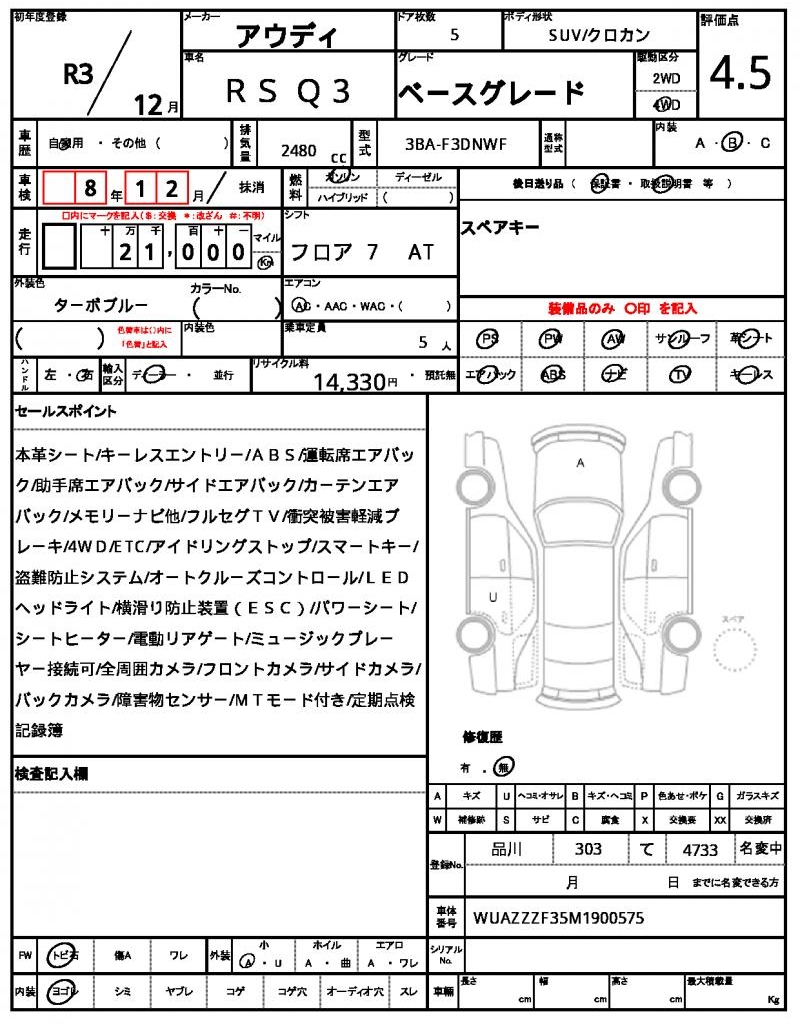 Meet this stunning 2021 AUDI RS Q3, a sleek blue SUV that’s sure to turn heads. Under the hood, you’ll find a powerful 2480 cc gasoline engine, paired with a 4WD system and featuring aluminum wheels and power windows for added convenience. As a used car, this RS Q3 is available for international buyers through AutoXGlobal, offering a hassle-free way to bring this Japanese export to your doorstep. With its Audi badge and RS Q3 designation, this Japanese used car export is a unique opportunity to own a high-performance SUV with a touch of international flair.