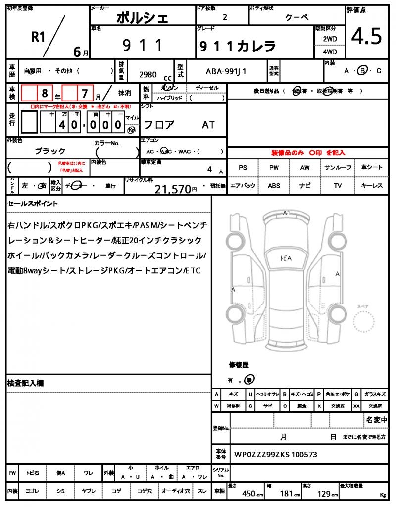 This sleek 2019 Porsche 911 Coupe is a black beauty that turns heads on the road. Under the hood, you’ll find a powerful 2980cc gasoline engine, paired with a 2WD drive system that provides a smooth ride. As a used car from Japan, this Porsche 911 is now available through AutoXGlobal for international buyers, complete with a maintenance log and record book to give you peace of mind. Experience the thrill of driving a Japanese used car export, this Porsche 911 Coupe, and enjoy the comfort of air conditioning as you cruise the streets.
