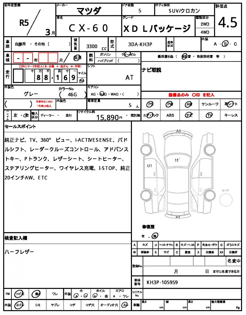 Meet the 2023 MAZDA CX-60 SUV, a sleek gray ride with a powerful 3300cc diesel engine and 2-wheel drive. With features like power steering and power windows, this Mazda CX-60 is designed for comfort and convenience. This Japanese used car is available for international buyers through AutoXGlobal, making it easy to bring this reliable ride to your doorstep. Check out this 2023 MAZDA CX-60 Japanese used car export today!