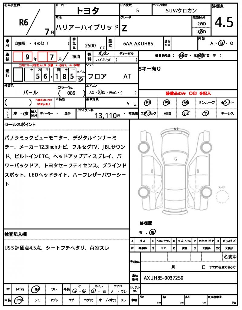 Meet the 2024 TOYOTA HARRIER HYBRID, a sleek Pearl SUV that’s ready to hit the road. Under the hood, you’ll find a 2500cc engine running on gasoline, paired with a 4WD system and power steering for a smooth ride. As a used car export from Japan, this vehicle is available through AutoXGlobal for international buyers. Whether you’re looking for a reliable daily driver or a comfortable adventure companion, the TOYOTA HARRIER HYBRID is a great option for those seeking a Japanese used car export.