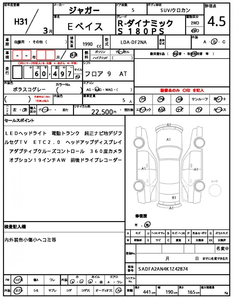 This 2019 Jaguar E-PACE SUV is a sleek gray ride that’s sure to turn heads. Under the hood, you’ll find a 1990 cc diesel engine, paired with a 4WD system for smooth handling, and features like power steering and aluminum wheels for a premium driving experience. As a used car from Japan, this E-PACE is available for international buyers through AutoXGlobal. With its unique blend of luxury and ruggedness, this Japanese used car export is a great choice for anyone looking for a reliable and stylish ride.