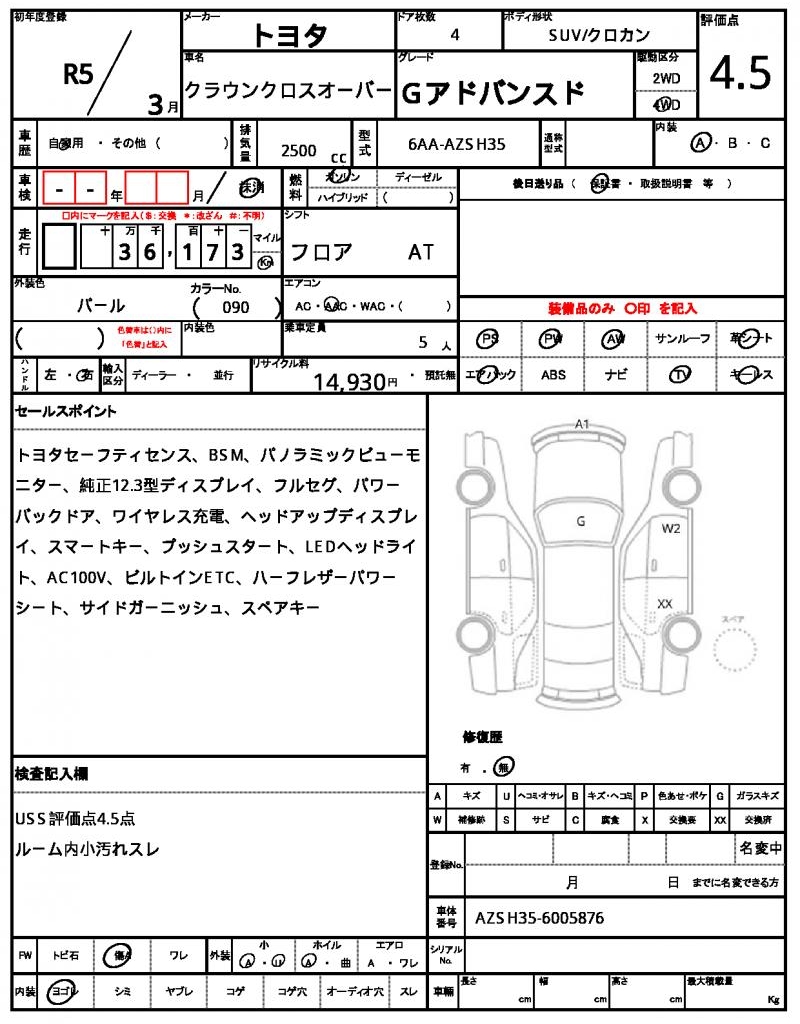 The 2023 Toyota Crown Crossover is a sleek Pearl-colored SUV that’s sure to turn heads on the road. Under the hood, you’ll find a reliable 2500 cc gasoline engine paired with a 4WD system, making it perfect for navigating any terrain. As a used car from Japan, this vehicle has been inspected and certified by AutoXGlobal, making it a great option for international buyers. If you’re looking for a Japanese used car export, the 2023 Toyota Crown Crossover is a fantastic choice with features like power steering and power windows, all wrapped up in a durable and stylish package.