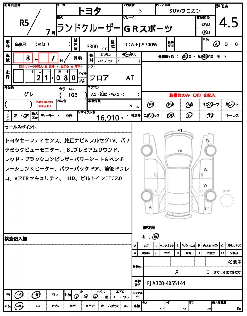 The 2023 TOYOTA LAND CRUISER in gray is a rugged SUV that’s ready to take on any terrain. Under the hood, you’ll find a powerful 3300 cc diesel engine paired with a 4WD system, making it perfect for off-road adventures. As a used car export from Japan, this LAND CRUISER is available through AutoXGlobal for international buyers. Whether you’re looking for a reliable daily driver or a trusty companion for your next adventure, this TOYOTA LAND CRUISER export from Japan is a great option.