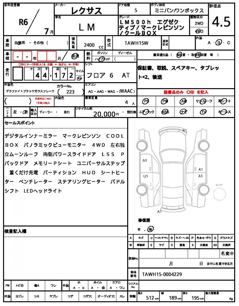 This 2024 LEXUS LM minivan is a sleek black ride with a lot to offer. Under the hood, you’ll find a 2400cc hybrid engine that’s perfect for city driving or long road trips, and with 4WD capabilities, you’ll have no trouble navigating rough terrain. As a used car from Japan, this LM has been carefully inspected and is now available for international buyers through AutoXGlobal. If you’re looking for a reliable and feature-packed Japanese used car export, look no further than this exceptional LEXUS LM.