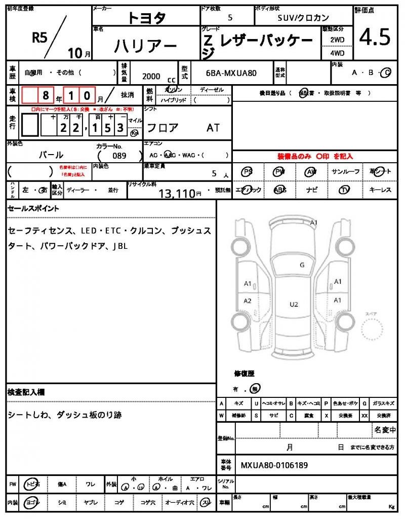 Meet the 2023 Toyota Harrier, a sleek and reliable SUV that turns heads on the road. Under the hood, you’ll find a powerful 2000 cc engine running on gasoline, paired with a smooth 2WD system and features like power steering and power windows for added convenience. This Pearl-colored beauty is now available through AutoXGlobal for international buyers looking for a great used car deal. Don’t miss out on the opportunity to import this Japanese used car export, a 2023 Toyota Harrier that’s sure to provide years of reliable service.