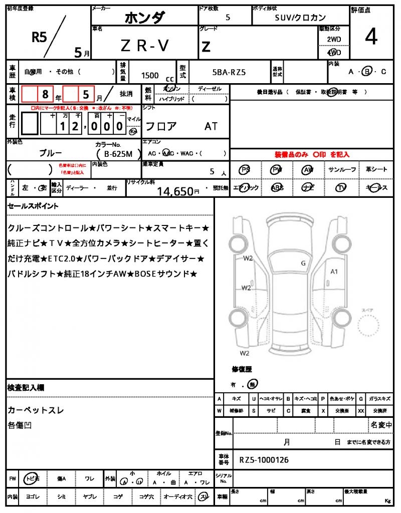 Meet the 2023 HONDA ZR-V, a stunning blue SUV that’s sure to turn heads. Under the hood, you’ll find a reliable 1500 cc engine fueled by gasoline and mated to a 4WD system, making it perfect for navigating rough terrain. As a used car from Japan, this ZR-V has been carefully sourced for international buyers through AutoXGlobal, ensuring a hassle-free ownership experience. With its power steering and power windows, this HONDA ZR-V is a top-notch Japanese used car export that’s ready for its new home.