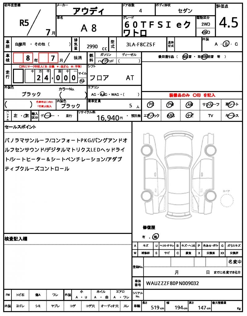 This sleek 2023 AUDI A8 sedan stands out in black, boasting a powerful 2990cc hybrid engine that delivers smooth performance and excellent fuel efficiency. With 4WD and features like power steering and power windows, this ride is a treat to drive. As a used car from Japan, this AUDI A8 is now available for international buyers through AutoXGlobal. For those seeking a reliable and feature-packed Japanese used car export, the 2023 AUDI A8 is a top choice.