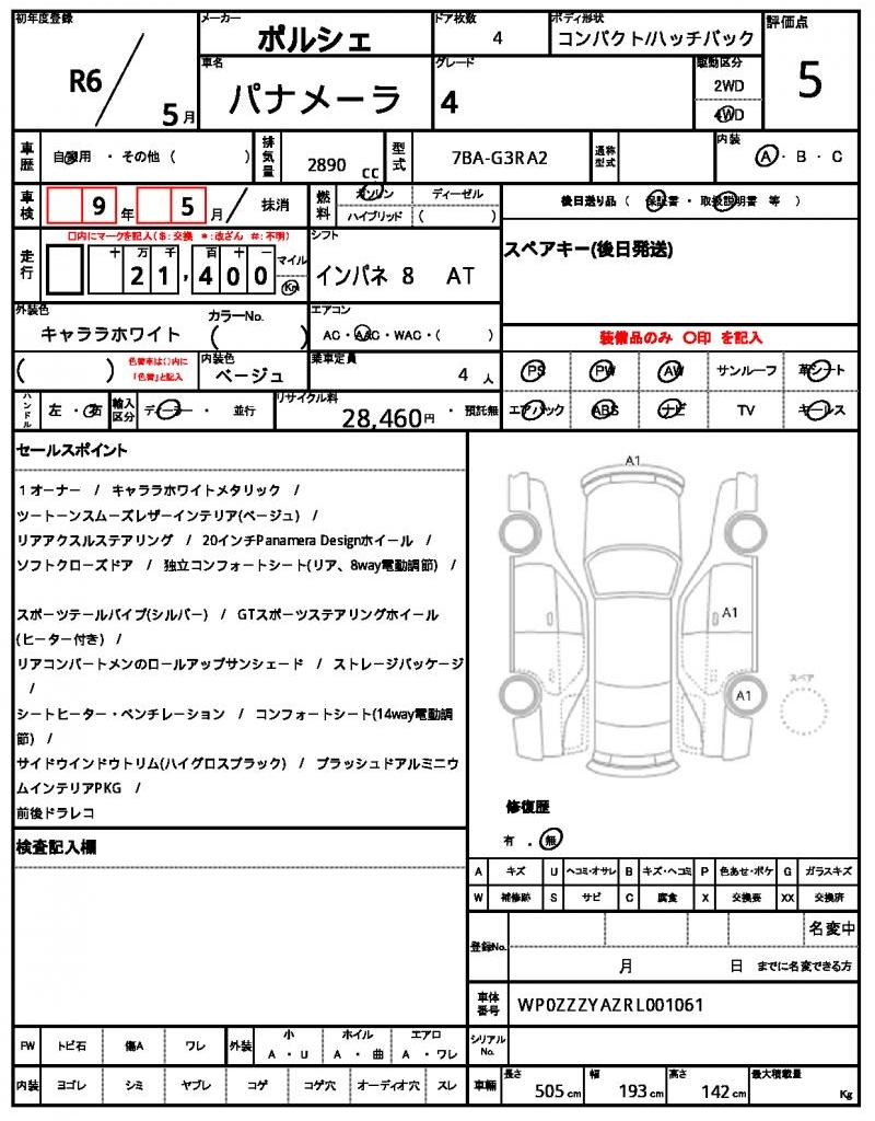 Meet the 2024 Porsche Panamera, a sleek Pearl-colored hatchback that packs a punch. Under the hood, you’ll find a 2890cc engine fueled by gasoline and paired with 4WD, making it a force to be reckoned with on the road. As you navigate the streets, you’ll appreciate the power steering and power windows that come standard on this luxurious ride. Available exclusively through AutoXGlobal, this used Porsche Panamera is a Japanese used car export perfect for international buyers looking to own a piece of the German automotive legend.