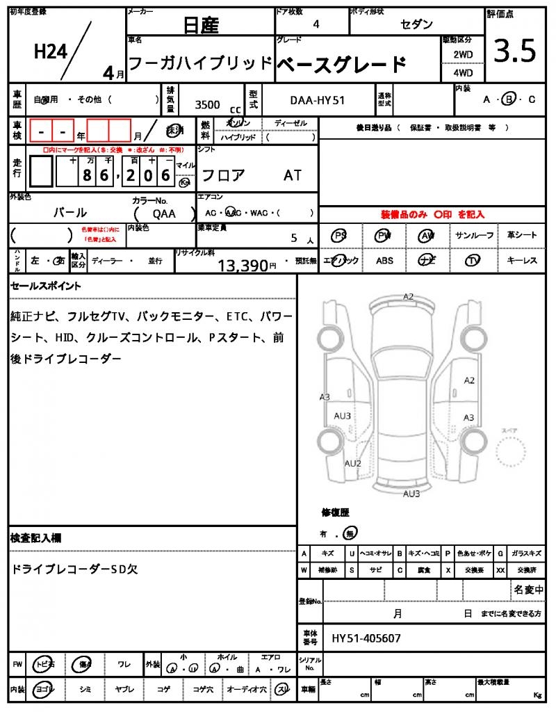 The 2012 Nissan Fuga Hybrid Pearl sedan is a rare find, offering a unique blend of style and eco-friendliness. Under the hood, you’ll find a 3500 cc gasoline engine, paired with a 2WD system and features like power steering and power windows. As a used car from Japan, this vehicle is available exclusively through AutoXGlobal for international buyers. For those seeking a reliable and fuel-efficient Japanese used car export, the 2012 Nissan Fuga Hybrid is an excellent choice.