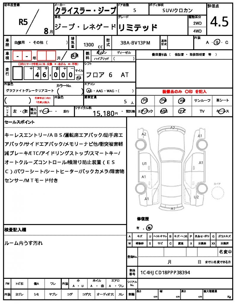 This 2023 CHRYSLER JEEP RENEGADE SUV is a sleek gray ride, perfect for adventure seekers. Under the hood, you’ll find a 1300cc gasoline engine, paired with a 2-wheel drive system and convenient power steering. This used car, available through AutoXGlobal for international buyers, also features power windows and aluminum wheels for a premium driving experience. Check out this Japanese used car export, a reliable and feature-packed CHRYSLER JEEP RENEGADE, ready to hit the roads around the world. The Chrysler Jeep Jeep Renegade is available for export from Japan through AutoXGlobal.