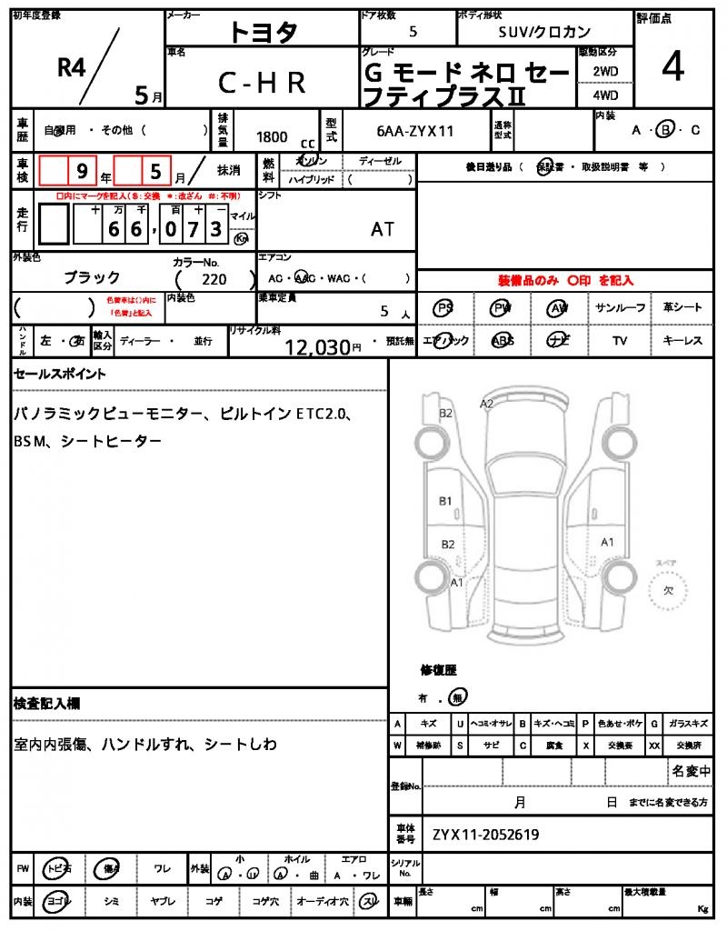 Meet the 2022 Toyota C-HR, a sleek and modern black SUV that’s sure to turn heads. Under the hood, you’ll find a reliable 1800cc gasoline engine, paired with a 2WD drive system for smooth handling and great fuel efficiency. As you slide into the driver’s seat, you’ll appreciate the convenience of power steering and power windows, making every drive a breeze. This exceptional vehicle is a Japanese used car export, available exclusively through AutoXGlobal for international buyers looking to bring home the best.