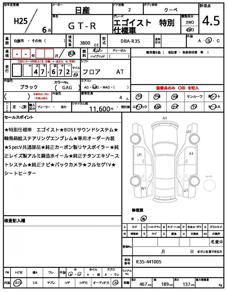 Meet the 2013 Nissan GT-R, a sleek black coupe that packs a powerful punch. Under the hood, you’ll find a 3800cc engine that runs on gasoline, and with its 4WD system, you’ll have the traction and control you need. As a used car from Japan, this GT-R is available exclusively through AutoXGlobal for international buyers. Whether you’re looking for a thrill on the track or a comfortable daily driver, this Japanese used car export of the Nissan GT-R is sure to deliver.