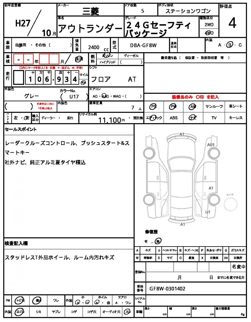 The 2015 Mitsubishi Outlander Wagon, painted in a sleek gray, is a reliable and practical vehicle that’s perfect for families or outdoor enthusiasts. Under the hood, you’ll find a 2400cc gasoline engine, paired with a 4WD system for added traction, and featuring power steering for effortless maneuverability. This used car is available for international buyers through AutoXGlobal, offering a unique opportunity to import a high-quality vehicle from Japan. For those seeking a rugged and reliable ride, the 2015 Mitsubishi Outlander Wagon is a top choice for export from Japan.