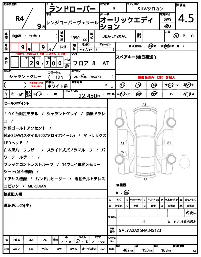 This 2022 Land Rover Range Rover Velar is a sleek gray SUV that’s sure to turn heads. Under the hood, you’ll find a 1990cc gasoline engine paired with 4WD, and enjoy features like power steering and power windows. As a used car from Japan, this Range Rover Velar is available through AutoXGlobal for international buyers looking for a reliable ride. Looking for a unique find?