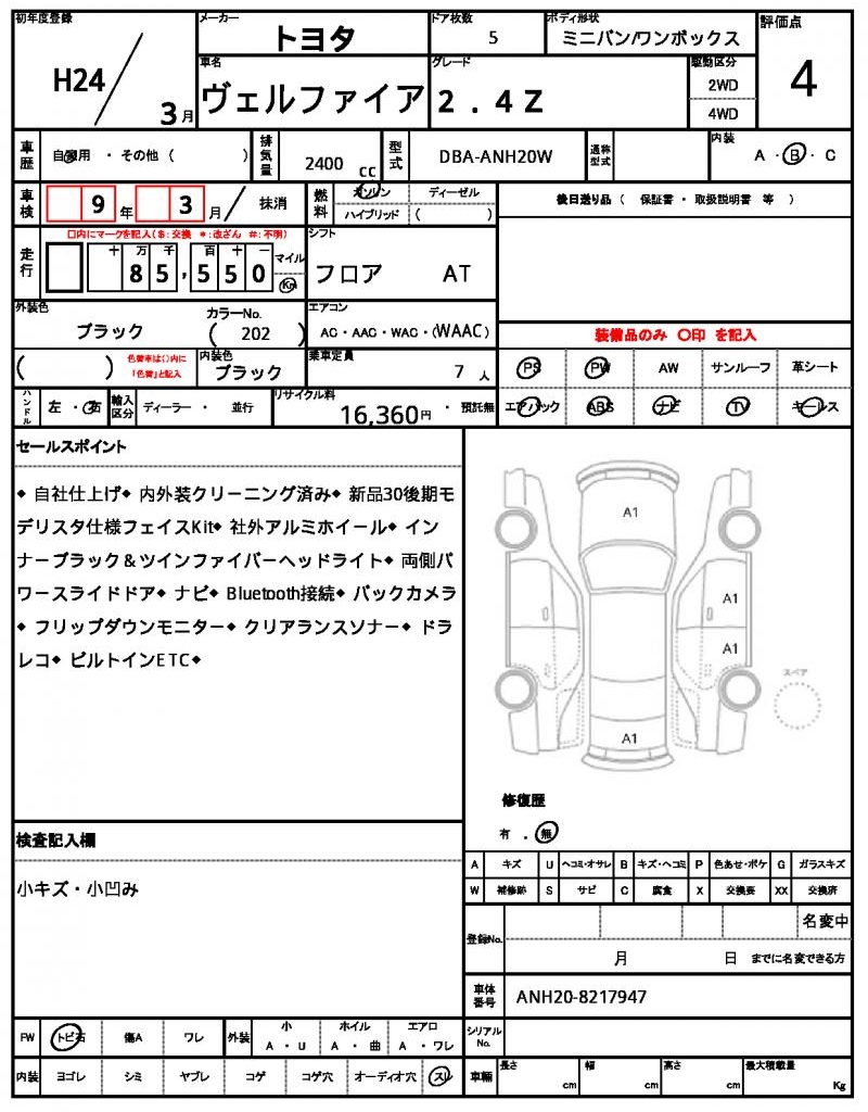 The 2012 TOYOTA VELLFIRE, a sleek and reliable black minivan, is ready to hit the road. Under the hood, you’ll find a 2400cc gasoline engine, paired with 2WD for a smooth ride, and features like power steering and power windows to make driving a breeze. As a used car from Japan, this VELLFIRE is available for international buyers through AutoXGlobal. If you’re looking for a dependable and feature-packed Japanese used car export, look no further than this 2012 TOYOTA VELLFIRE.