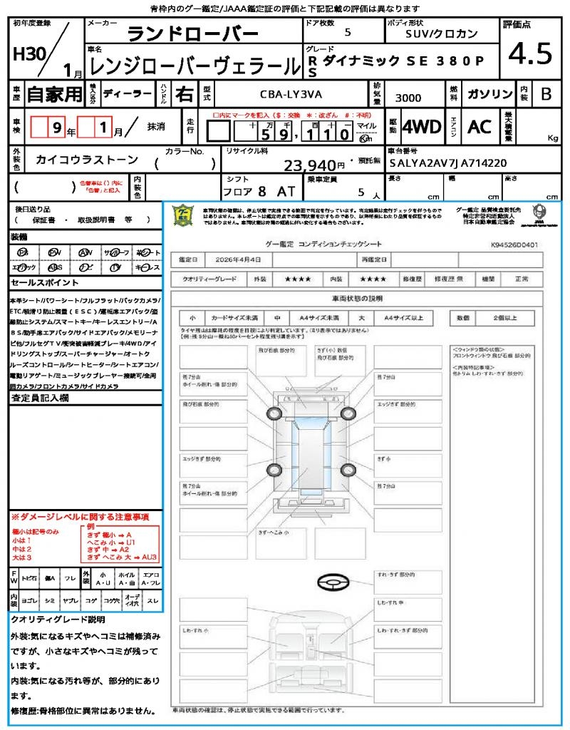 Meet the 2018 Land Rover Range Rover Velar, a sleek and capable SUV with a charming tea color finish. Under the hood, you’ll find a powerful 3000cc gasoline engine, paired with a 4WD system for confident handling on a variety of terrain. This is a used car from Japan, available exclusively through AutoXGlobal for international buyers. As a Japanese used car export, the 2018 Land Rover Range Rover Velar offers a unique blend of Land Rover’s iconic style and reliability, making it an attractive option for those looking to import a high-quality SUV from abroad.