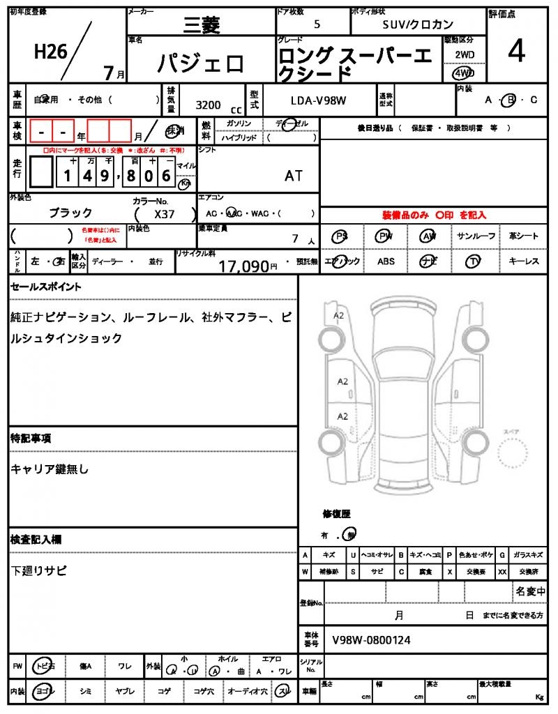 Meet the 2014 Mitsubishi Pajero, a rugged black SUV with a commanding presence on the road. Under the hood, you’ll find a reliable 3200cc diesel engine, paired with a 4WD system that can tackle any terrain, and featuring power steering for effortless handling. This Mitsubishi Pajero is a used car from Japan, now available through AutoXGlobal for international buyers. Experience the thrill of driving a Japanese used car export, the 2014 Mitsubishi Pajero, with its aluminum wheels and power windows for a comfortable and convenient ride.