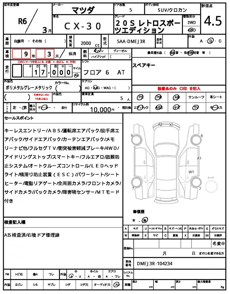 Meet the 2024 MAZDA CX-30, a sleek gray SUV that’s sure to turn heads on the road. Under the hood, you’ll find a 2000 cc gasoline engine, paired with a 4WD drive system for maximum traction and control. As a used car from Japan, this MAZDA CX-30 has been carefully selected and is now available through AutoXGlobal for international buyers. Get behind the wheel of this reliable and feature-packed Japanese used car export, with power steering and power windows for added convenience.