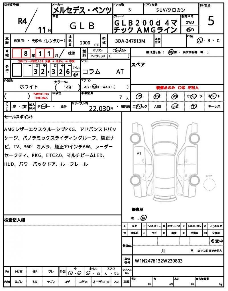 Meet the 2022 MERCEDES BENZ GLB, a sleek and powerful white SUV that’s ready to hit the road. Under the hood, you’ll find a 2000 cc diesel engine with 4WD capabilities, making it perfect for tackling any terrain. As a used car from Japan, this MERCEDES BENZ GLB is available for international buyers through AutoXGlobal, offering a convenient and hassle-free export process. This Japanese used car export is a great opportunity to own a reliable and feature-packed MERCEDES BENZ GLB, complete with power steering and power windows for added convenience.