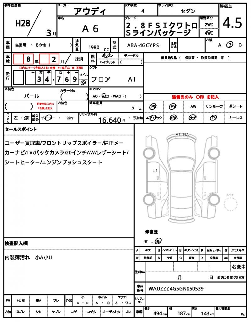 This stunning 2016 AUDI A6 Sedan is finished in a beautiful Pearl color, a true head-turner on the road. Under the hood, you’ll find a 1980cc gasoline engine, paired with a 4WD drive system for added traction and control. As a used car from Japan, this AUDI A6 is available for international buyers through AutoXGlobal. If you’re looking for a reliable and feature-packed Japanese used car export, look no further than this 2016 AUDI A6.