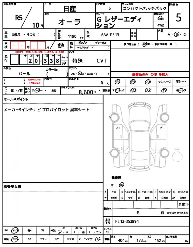 Meet the 2023 Nissan Aura, a sleek Pearl-colored hatchback that’s sure to turn heads on the road. Under the hood, you’ll find a reliable 1190cc engine that’s paired with gasoline fuel and 2WD drive, making it a great choice for city driving. As a used car from Japan, this Aura is available through AutoXGlobal for international buyers looking for a reliable ride. This Japanese used car export is packed with convenient features like power steering and power windows, and its aluminum wheels add a touch of sophistication to its overall design.