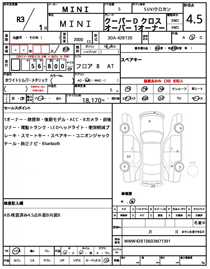 This sleek 2021 MINI MINI SUV is a head-turner in its crisp white finish. Under the hood, you’ll find a reliable 2000cc diesel engine, paired with a 2WD drive system and featuring power steering for a smooth ride. As a used car, this MINI MINI is available for international buyers through AutoXGlobal, providing a hassle-free exporting process. If you’re in the market for a reliable Japanese used car export, the 2021 MINI MINI SUV is a great option, complete with power windows and stylish aluminum wheels.
