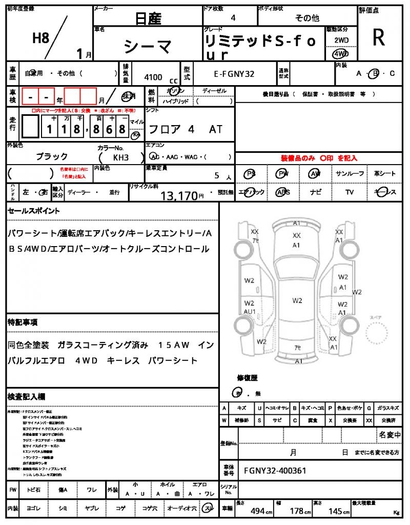The 1996 NISSAN CIMA is a sleek black sedan with a powerful engine under the hood. This 4100 cc gasoline-powered ride features 4WD and gets a boost from power steering, making it a pleasure to drive on any terrain. As a used car from Japan, this CIMA is available exclusively through AutoXGlobal for international buyers. Check out this reliable NISSAN CIMA for export from Japan, complete with power windows and stylish aluminum wheels.