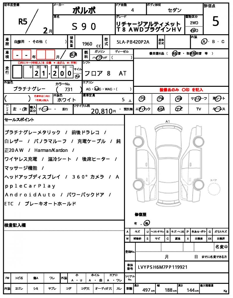 This 2023 VOLVO S90 sedan is a sleek and powerful gray machine, featuring a robust 1960 cc hybrid engine that provides a smooth and efficient driving experience, complete with power steering and aluminum wheels. With 4WD capabilities, you’ll be able to tackle any terrain with confidence. As a used car export from Japan, this VOLVO S90 is available for international buyers through AutoXGlobal. Take advantage of this opportunity to import a reliable and feature-packed Japanese used car export, the VOLVO S90, with its advanced hybrid powertrain and premium features.